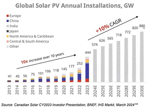 A Canadian study on photovoltaics (PV) shows that silver demand for PV has increased tenfold over the past 10 years. The study projects an annual increase of only 10% until 2030, but estimates that PV alone is expected to consume 880 million ounces (Moz) of silver in 2030. This means that the photovoltaic sector alone will consume MORE than all annual mining production! This comes at a time when the market has already been in deficit every year for the past 6 years: