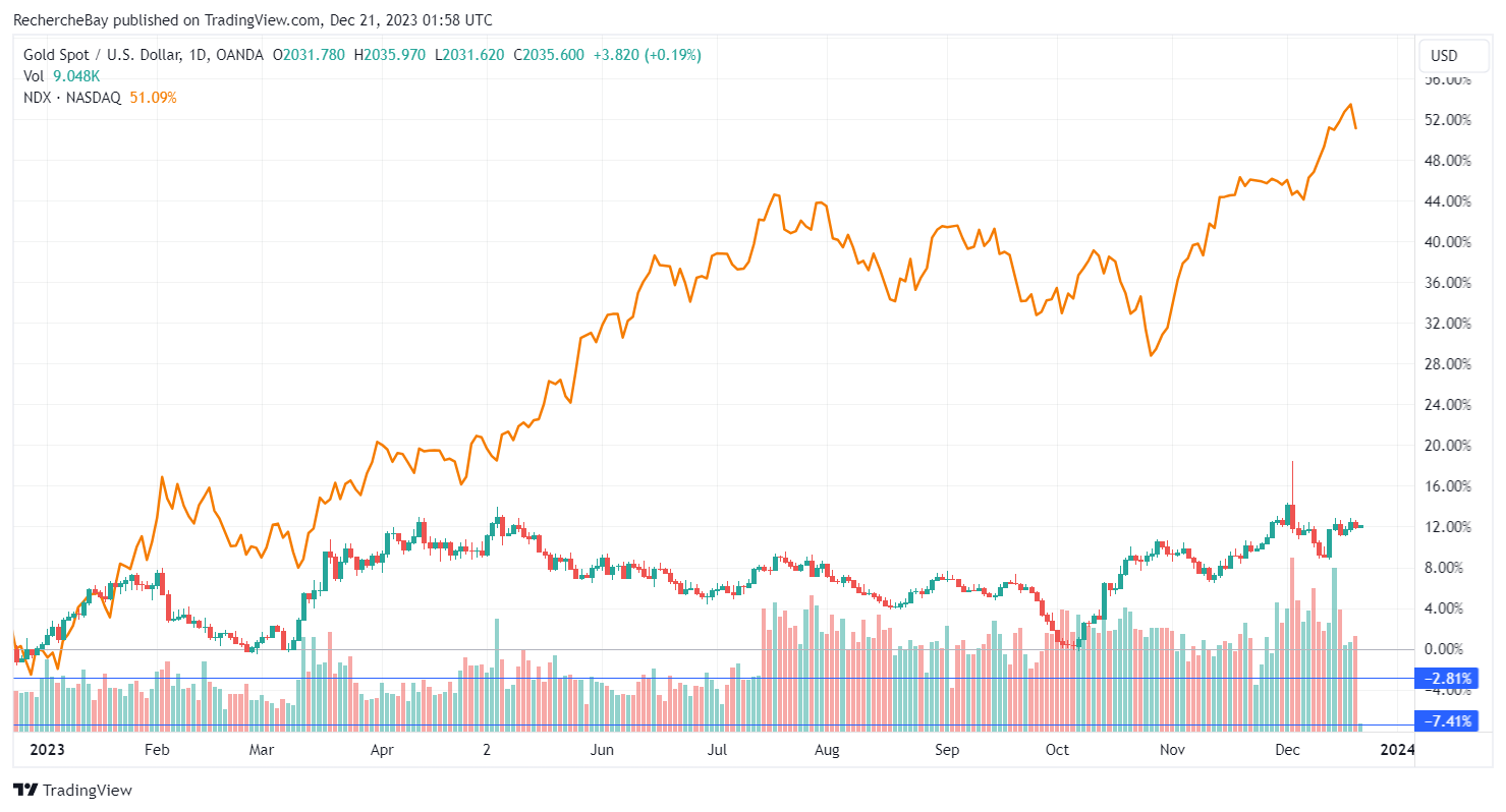 The Nasdaq has significantly outperformed gold this year, making it difficult to justify gold as a safe haven. All the more so as recession has been avoided in the US this year, and the Fed has raised its GDP growth forecasts for next year.