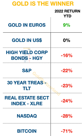Gold in euros as well as gold in most other currencies have had a positive return in 2022 so far.