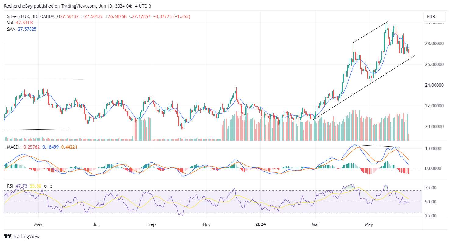 The situation for silver in euros is more fragile. A bearish divergence has formed, threatening to break the uptrend started on May 1: