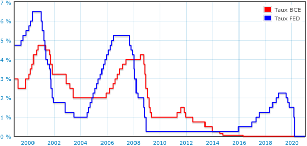 The European Central Bank (ECB) is content to follow suit. The aim is to avoid too strong an appreciation of the euro against the dollar. However, it will make its decision in 2011-2012 in order to face the Greek crisis. Its key rate joined that of the Fed, then fell to zero in 2016.
