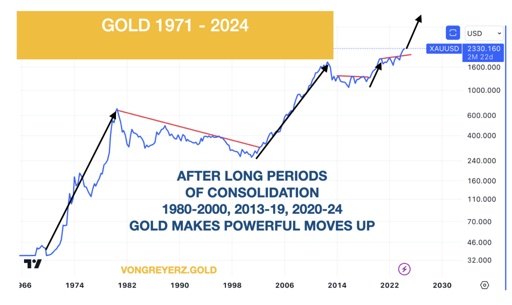 Gold makes powerful moves and then goes sideways for long periods. After the gold explosion from $35 in 1971 to $850 in 1980, gold spent 20 years correcting until 2000.