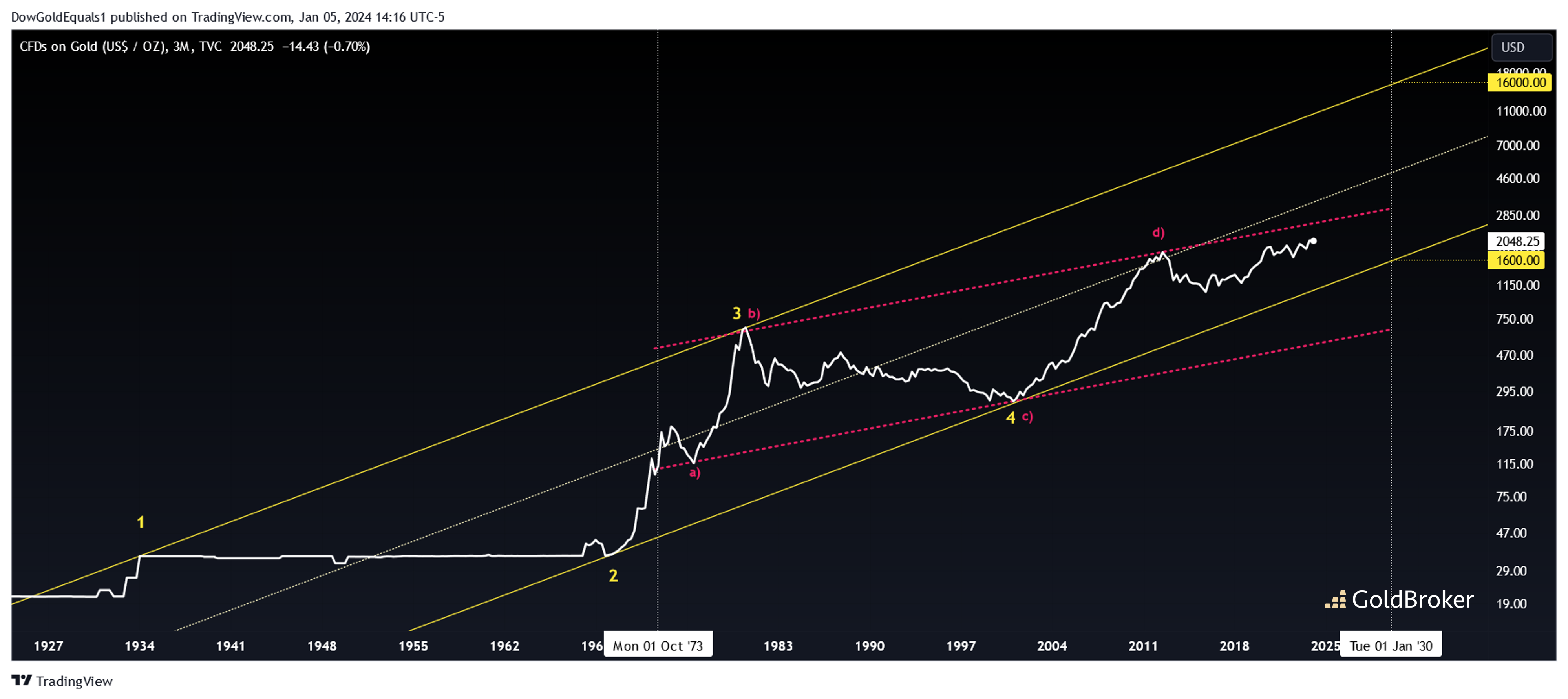Looking out to the year 2030, we can see that if price is to remain in this 100-year channel, it will be no lower than $1,600 but could rise to as high as $16,000. That provides a maximum downside of about 20% and a maximum upside of about 8X. Should price get back to the midline by then, it would be about $5,000. Note the secondary pink channel that began in 1973. Breaking out of this channel will certainly be key to activating higher price targets within the yellow channel.