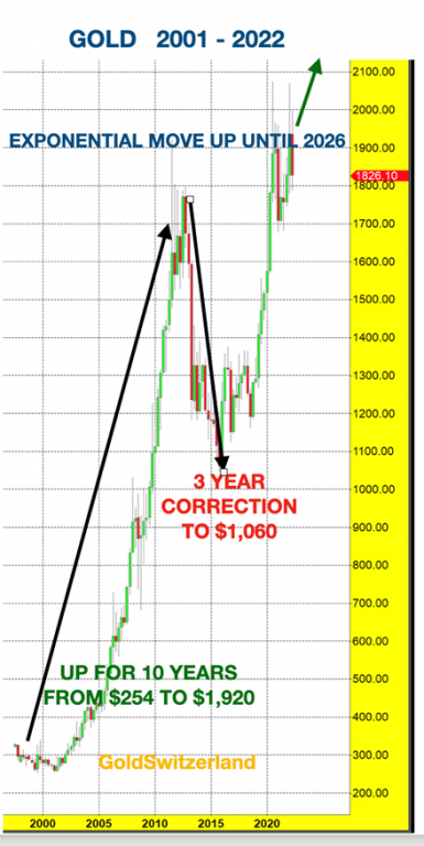 Gold started an uptrend in year 2001 that lasted for 10 years to 2011 when gold reached $1,920. After a major correction for 3 years until 2016, to $1,060, gold has resumed its exponential uptrend as can be seen in the chart below.