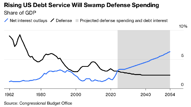 So based on the CBO (Congressional Budget Office), the US will spend more on interest than defence already at the end of 2024 as this chart shows: