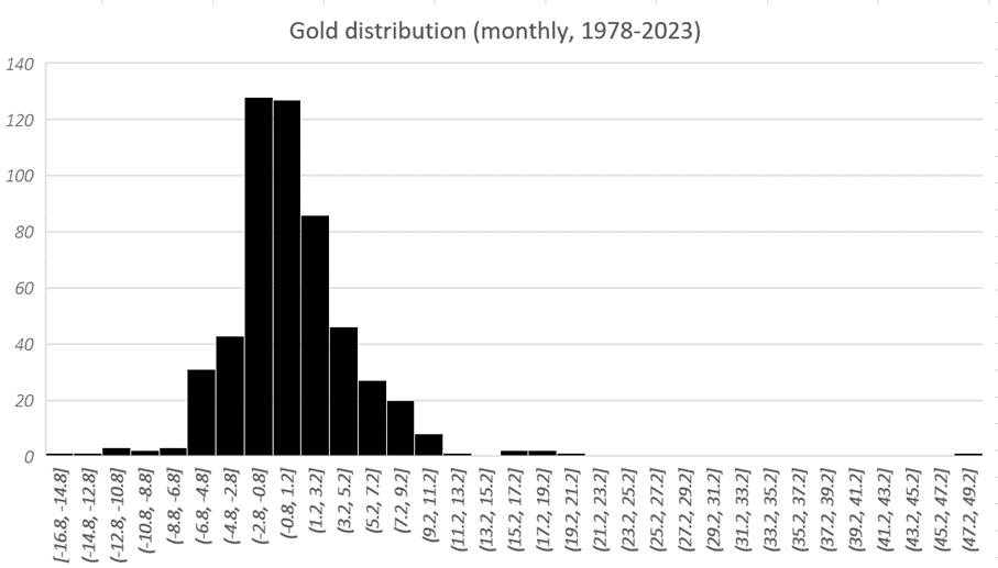 Finally, there are two reasons for selecting monthly variations (rather than daily, for example). Firstly, gold is a low-volatility asset. The annualized volatility of the gold price between 1978 and 2023 is 16.10%. Secondly, gold is an asset that should be considered from a longer-term perspective than equities. We showed this in a previous article.