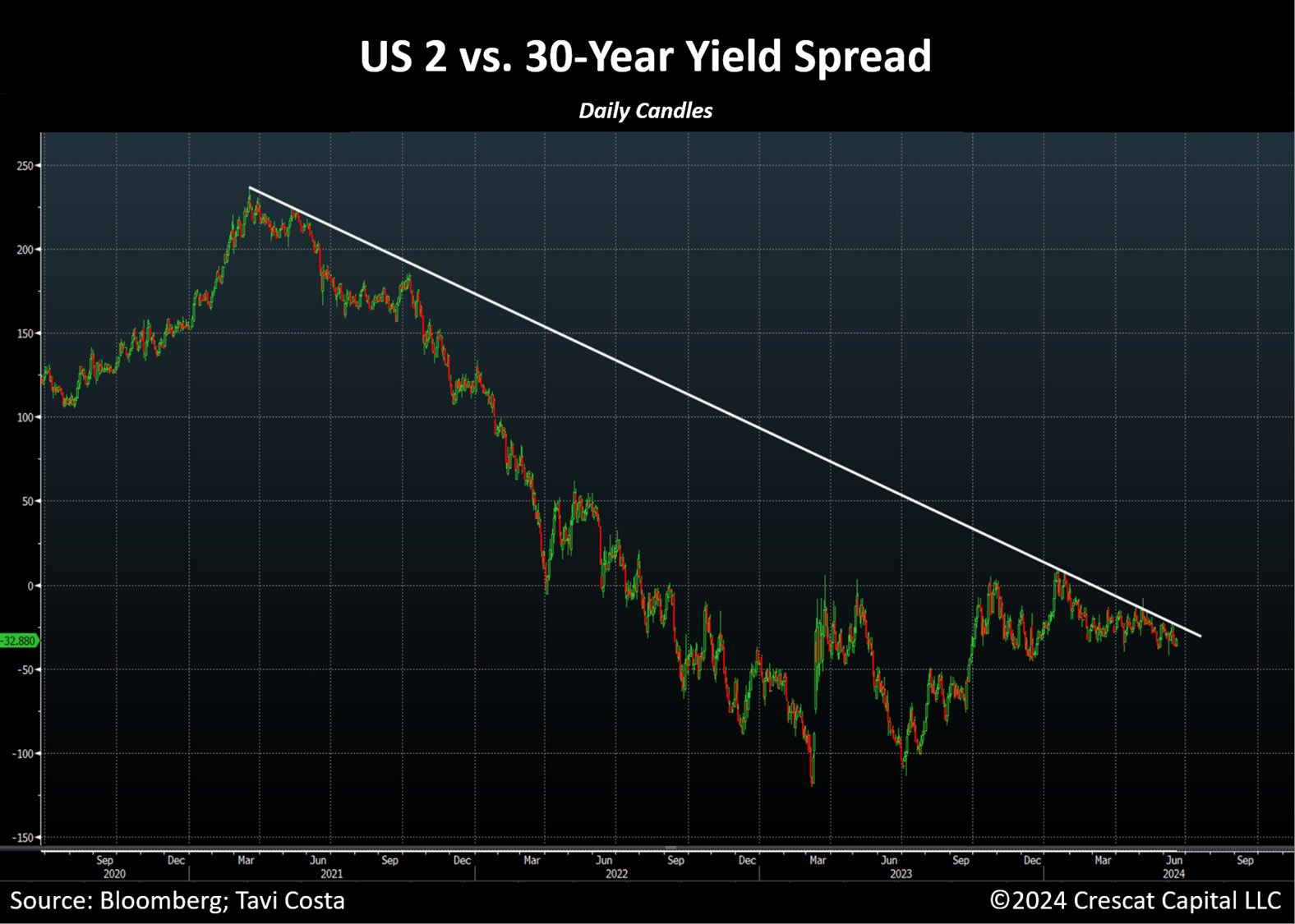 This week, Tavi Costa published a very interesting chart of the 2-year/30-year yield ratio:
